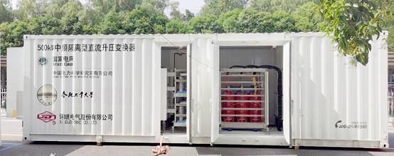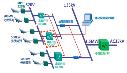 该项目在国家能源大型风电并网系统张北研发试验基地建成了1.5MW光伏直流升压并网实证平台,该平台包含三台500kW/±35kV光伏中压DC-DC变流装置,其中中频隔离型装置由工口实验室
