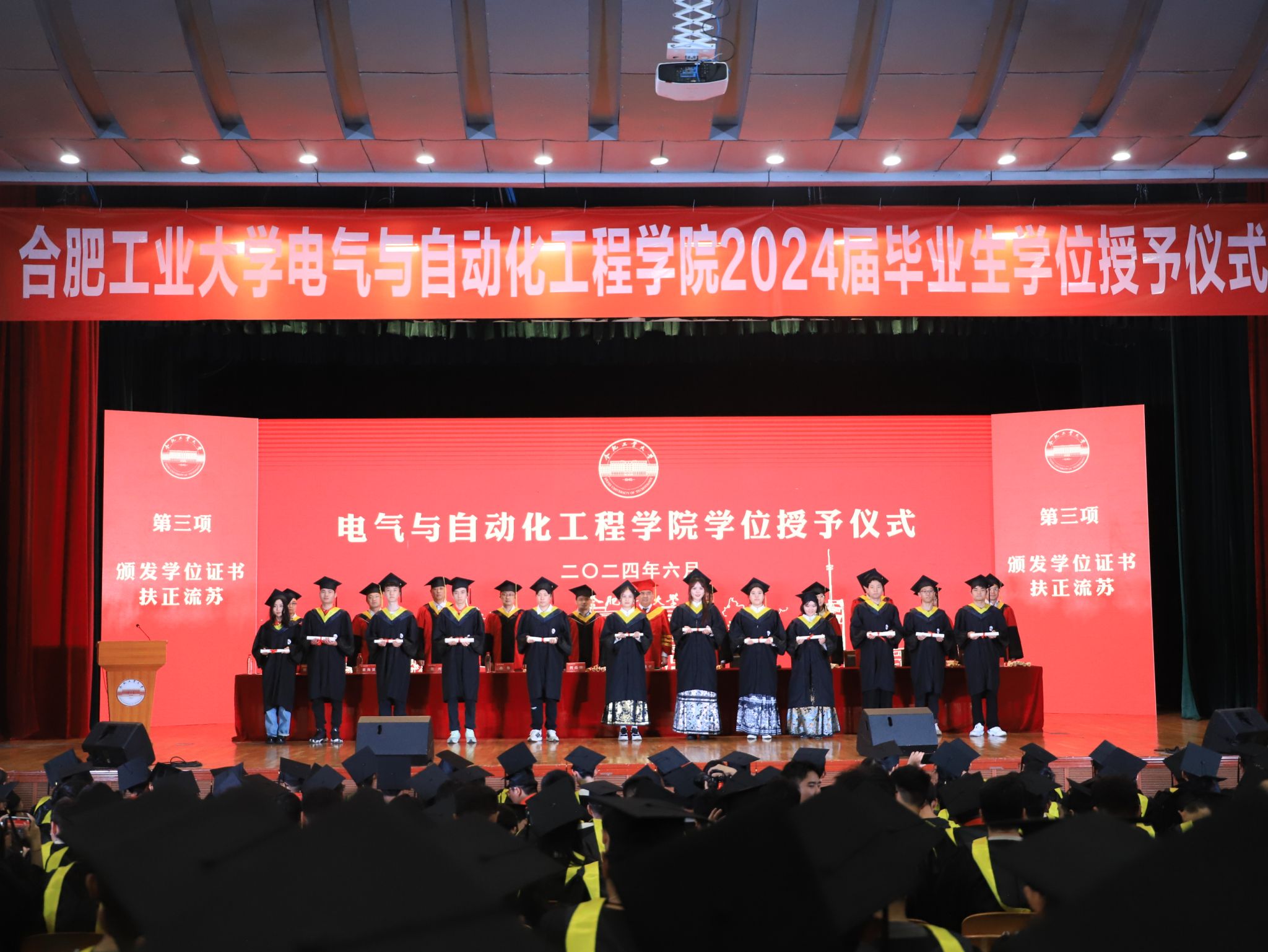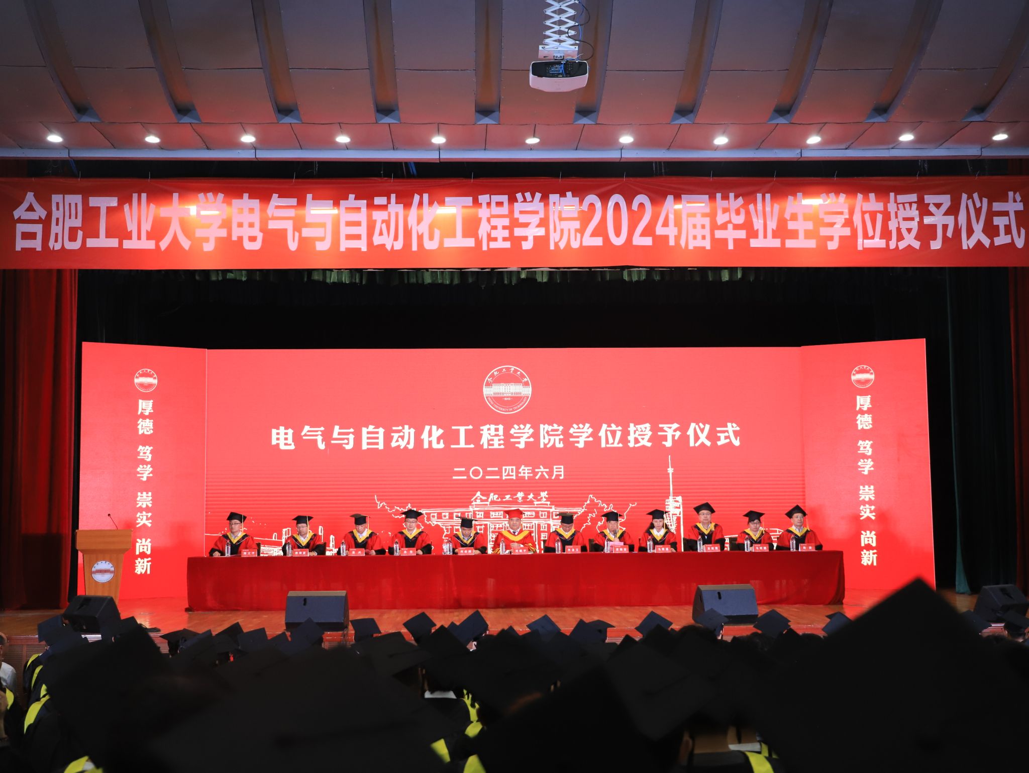 6月18日下午,电气与自动化工程学院2024届合肥校区毕业生学位授予仪式在屯溪路校区斛兵礼堂举行。校党委常委、副校长刘晓平出席仪式,学院相关负责人、学位评定委员会委员、教师代表、学生家长代表、校友代表以及2024届学士、硕士、博士学位获得者参加仪式。仪式由学院副院长黄海宏主持。