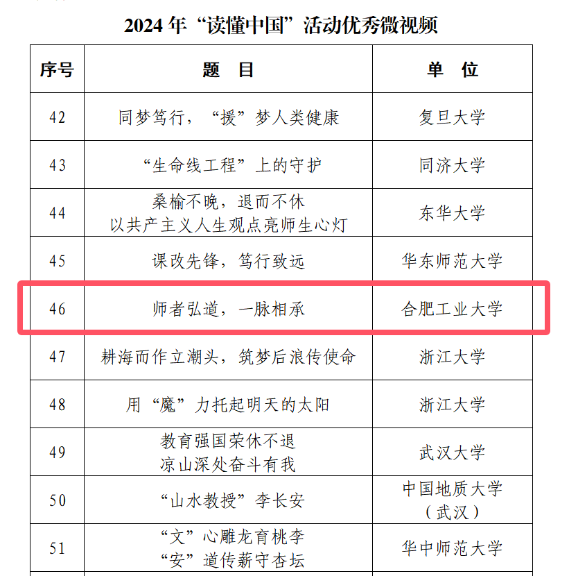 “师者弘道,一脉相承”作品在内的59个微视频入选2024年“读懂中国”活动优秀微视频。