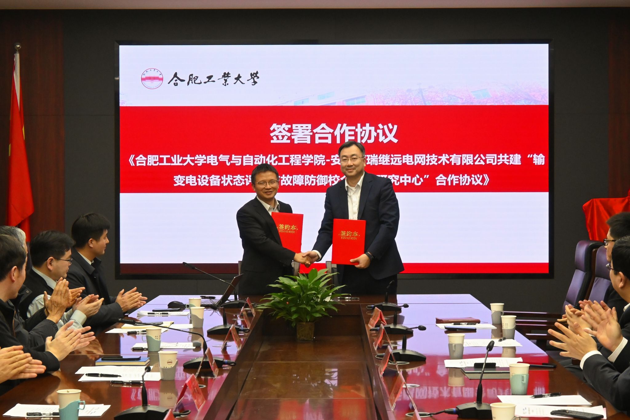 电气与自动化工程学院-安徽南瑞继远电网技术有限公司共建“输变电设备状态评估与故障防御校企联合研究中心”合作协议签署与揭牌仪式。校党委书记于祥成出席会议,校党委常委、副校长洪日昌主持会议。