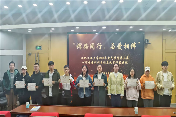 为培养学生自尊自信、理性平和、积极向上的健康心态,同时丰富校园文化生活,提升学生心理健康水平,营造和谐健康的校园心理氛围,4月8日,电气与自动化工程学院第三届“‘剧’暖你心,与爱同行”心理情景剧剧本征集比赛颁奖典礼在屯溪路校区学术会议中心二楼小报告厅举行,学院相关负责老师和参赛同学参加仪式。