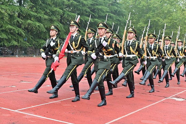 迎着东方的第一缕朝阳,升旗仪式正式开始。英姿飒爽的国旗护卫队,以饱满的姿态,迈着铿锵有力的步伐,护送国旗走向升旗台。伴随着国歌激昂的旋律,升旗手迎风振臂,鲜艳的五星红旗迎着初升的朝阳冉冉升起,迎风飘扬。全体师生庄严肃立,高唱国歌,深怀着对祖国无限热爱和崇高敬意,向国旗行注目礼。