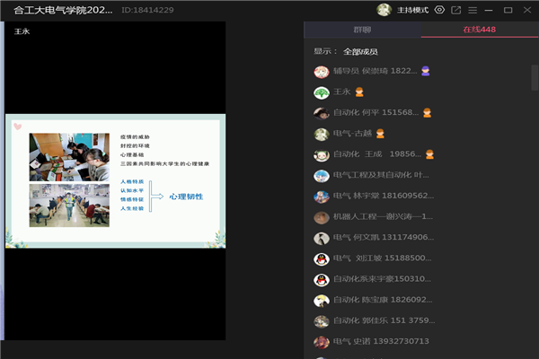 为帮助新生更好地开启大学生活,在疫情下认识生命的意义和价值,学会自我调适,培养积极健康的心态,10月28日晚,电气与自动化工程学院通过腾讯课堂平台学院开展“‘熠’路生花,心理韧性培养”新生生命教育讲座,活动邀请了合肥幼儿师范高等专科学校王永教授主讲,全体2022级本科新生聆听讲座。