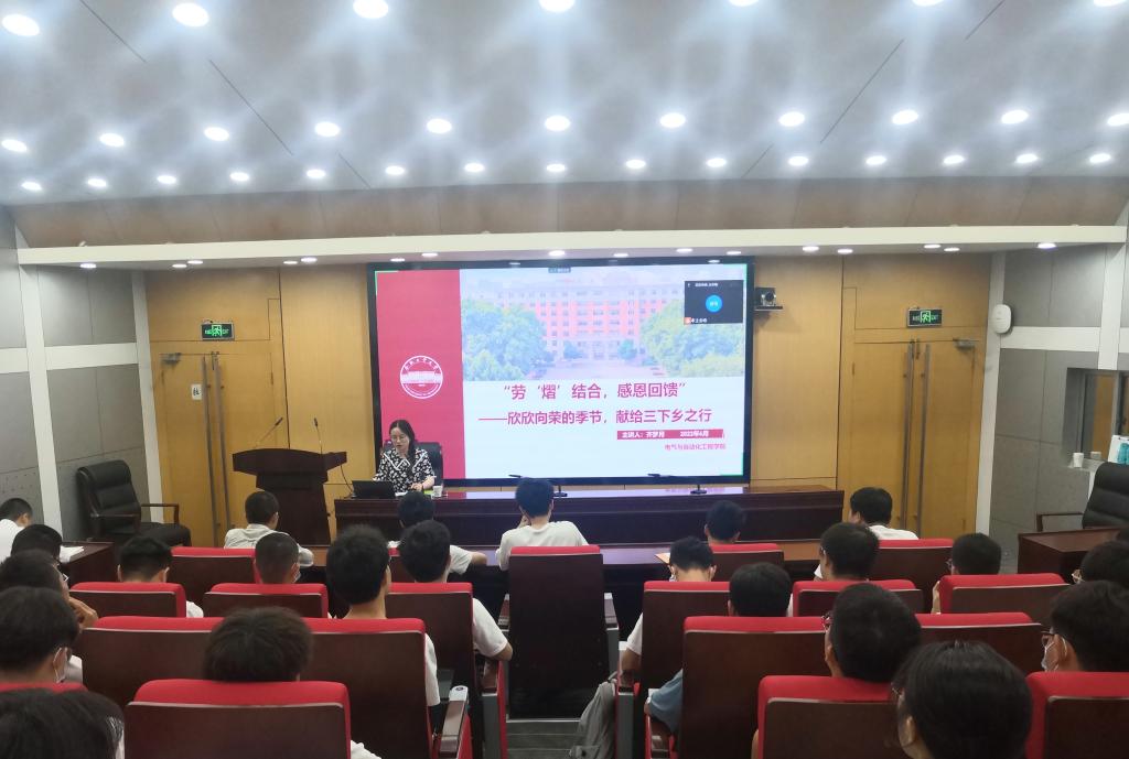 6月14日晚上,电气与自动化工程学院在学术会议中心小报告厅开展学院发展型资助活动“劳‘熠’结合,感恩回馈”——欣欣向荣的季节,献给三下乡之行。本次会议线上线下相结合,主要面向学院家庭经济困难学生进行活动解读和宣传动员。