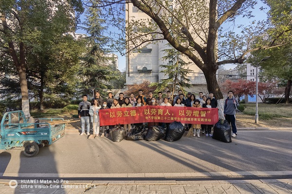 电气与自动化工程学院第22届学生会全体成员在学生社区服务大厅前开展劳动教育实践活动。