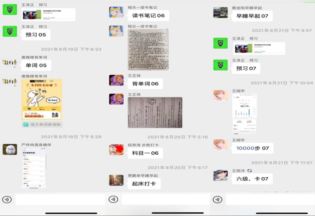 为营造良好的班级氛围,帮助同学们养成良好的自律习惯,2021年8月15日-8月28日,电气20-5班组织开展了“自律暑假我做主”14天打卡活动。班级同学积极参与,暑假的班级氛围从此热闹了起来。