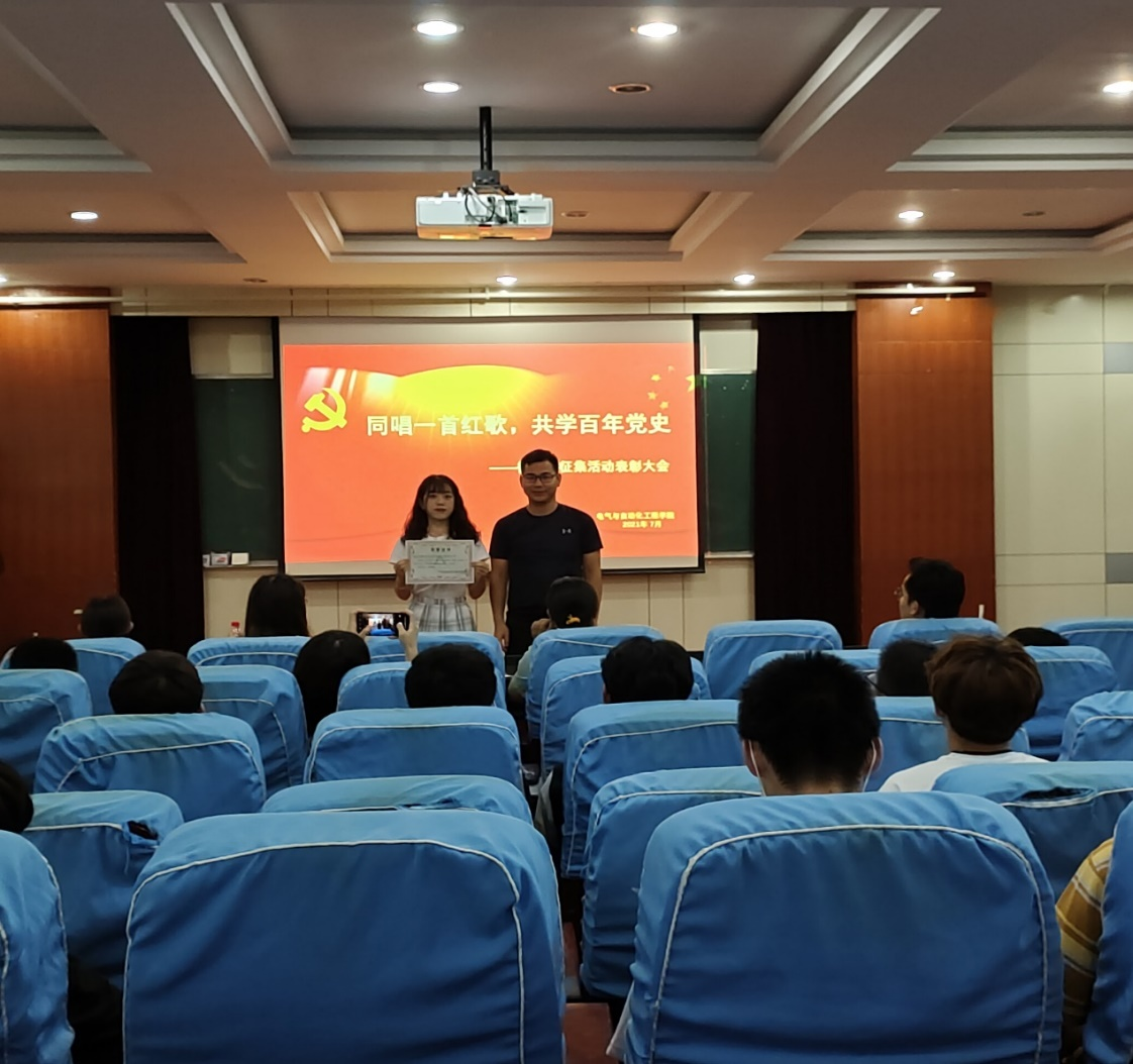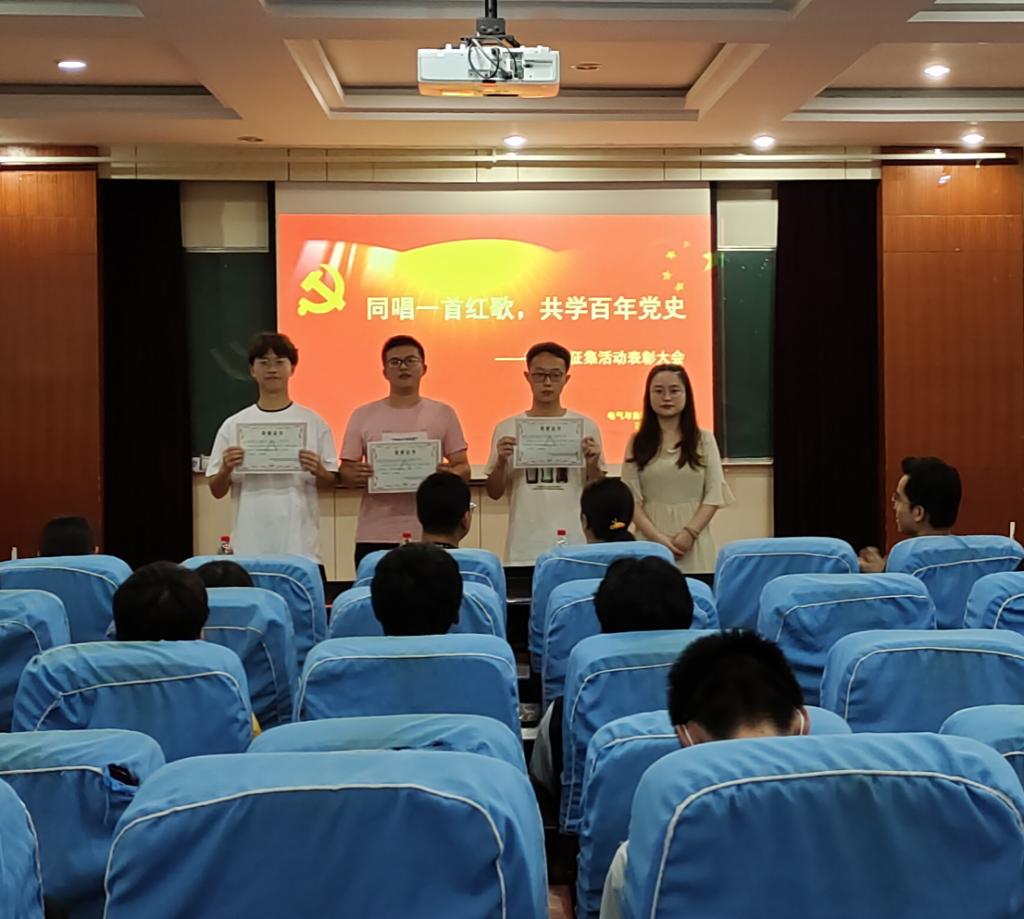 大会依次为本次获得优秀组织奖、三等奖、二等奖、一等奖的总共十三个团支部颁发奖状。其中,在本次活动中,电气工程及其自动化19-6班团支部积极组织班级同学参与活动,以高质量的微视频作品在本次活动中荣获一等奖和优秀组织奖。本次表彰大会对电气工程及其自动化19-6班团支部的优秀作品进行了现场展播,在场的老师和同学们一同了欣赏该团支部的演唱视频——《延安颂》。大会最后,闫志伟老师就本次活动进行了总结点评,提到本次“同唱一首红歌,共学百年党史”活动旨在让同学们通过演唱和拍摄微视频的方式,感受红歌歌词中所蕴含的红色革命精神,共同学习红歌歌词背后的百年党史。一首红歌就是一段历史缩影,一首首红歌熏陶着一代代人的成长。同学们在参与本次活动的过程中,不仅能够以唱红歌这一新颖的方式学习百年党史,而且还能让同学们在筹备活动的过程当中锻炼自己的组织、策划、剪辑等多方面能力,对同学们的成长和能力的提升是有所裨益的。