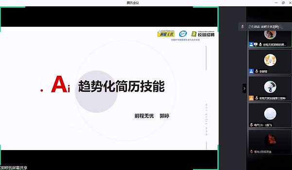 为提升学生的就业竞争力及简历制作能力,5月21日晚,电气与自动化工程学院举行“AI趋势化简历技能”线上讲座。活动邀请了前程无忧校园部经理王恒帅全程在线互动,前程无忧校园招聘部项目执行经理郭婷老师担任主讲,百余名同学参加在线培训。