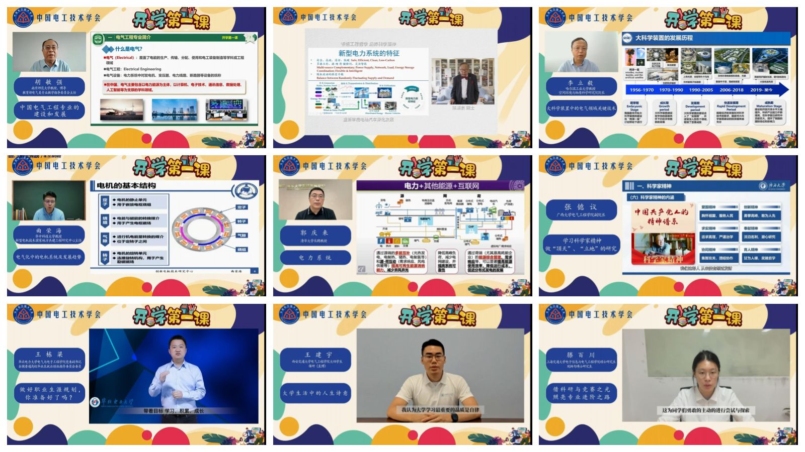 教育部高等学校电气类教学指导委员会主任胡敏强以《中国电气工程专业的建设和发展》为题,从电气工程专业简介、发展现状、专业人才需求、专业建设与发展四个维度开展了规范而全面的报告。他指出,习近平总书记在第七十五届联合国大会上首次提出的“双碳”目标对我国电力工业发展提出了新要求,以“发电、变电、输电、配电、用电”为主要环节的电力工业正在向低碳化、智能化、数字化、国际化的趋势发展,电气工程技术领域正在从传统电力技术转变为电力、电子、控制、信息、人工智能等先进技术交叉融合的复合技术领域。中国工程院院士陈清泉以《领悟工程哲学 涵养科学精神——重新审视电动汽车深化发展》为题,从工程哲学与科学精神、双碳目标、能源革命、出行革命、四网四流融合的角度使大家对“大电气”工程、创新型人才、智慧能源等关键词留下了深刻的印象。他勉励大家要牢记“Inspiration激情”“Imagination想象力”“Innovation创新”“Integration集成”“Implementation实现”“Investment投资”6个“I”,把创新变成技术,把技术变成产品,在世界流通。随后,哈尔滨工业大学李立毅教授、华中科技大学曲荣海教授、清华大学郭庆来教授、广西大学张镱议教授分别以《大科学装置中的电气领埃关键技术》《电气化中的电机系统及发展趋势》《电力系统》《学习科学家精神,做“顶天”、“立地”的研究》为题展开介绍。华北电力大学电气学院党委副书记王栋梁、西安交通大学本科生王建宇、上海交通大学硕士研究生滕百川分别从老师、学生的视角围绕大学生涯规划主题开展报告。电气工程及其自动化专业2023级本科生张熠表示,历久的电气史、弥新的建设业,面对电气领域知识宽度的巨大增长,我们要扎实学科基础,才能更好地为电气行业贡献智慧与力量。