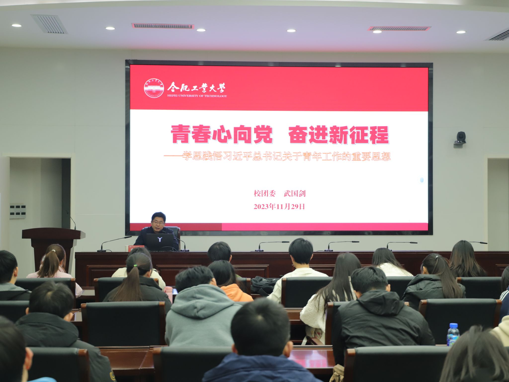 校团委书记兼副部(处)长、全国高校思想政治工作中青年骨干武国剑为全体学员上专题党课。分党校第70期大学生入党积极分子班全体学员参加学习。