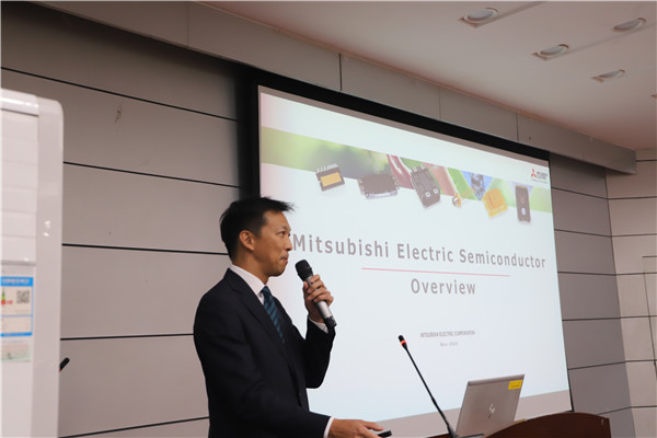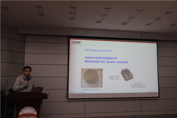 颁奖环节结束后,三菱电机半导体大中国区总经理赤田智史向同学们介绍了三菱电机集团的发展历程和企业目前的发展情况。三菱电机功率器件制作所高级技术顾问近藤晴房和三菱电机半导体大中国区新能源应用技术经理陆思清共同为在场的100多为本科生和研究生做了题为《三菱SiC功率芯片和功率模块的最新技术》的报告,内容包括功率半导体概述、Planar和Trench SiC芯片的基本知识、WBG电力器件业务战略、Planar SiC功率芯片的新技术、Trench SiC 功率芯片的新技术、家用电器SiC电源模块、工业应用SiC功率模块、用于铁路和电力、XEV的SiC功率模块、使用SiC功率模块的要点等。
