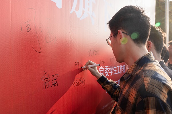 最后,各班学生代表走到活动主题墙前签名并合影,留下了自己的对对未来的美好愿景,升旗仪式到此落下帷幕。
