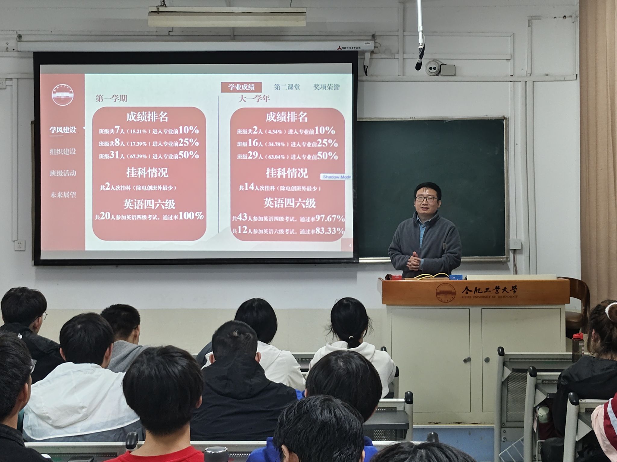 师语谆谆,筑梦未来。随后,班主任陈强接过话筒,他对班级同学在大一学年取得的成绩表示了肯定,并进一步强调,大学生活不仅是知识的积累,更是个人成长和自我探索的宝贵时期。他鼓励同学们勇于挑战自我,积极参与科创竞赛,以此锻炼能力、提升自身竞争力,不断增强自身综合素质。老师的话语如同春风,温暖而鼓舞人心。他结合班级的实际情况和电气工程行业的发展,分享了他对专业升学与就业路径的见解,他的话语中透露出对同学们的殷切希望,希望他们能够把握时代的脉搏,勇敢地追逐自己的梦想。他还特别强调了提前规划学业生涯的重要性,这不仅是对未来的规划,更是对自我价值实现的一次深思。同时,他表示愿意在这一过程中为同学们提供指导和帮助,如同一盏明灯般照亮同学们前行的道路。