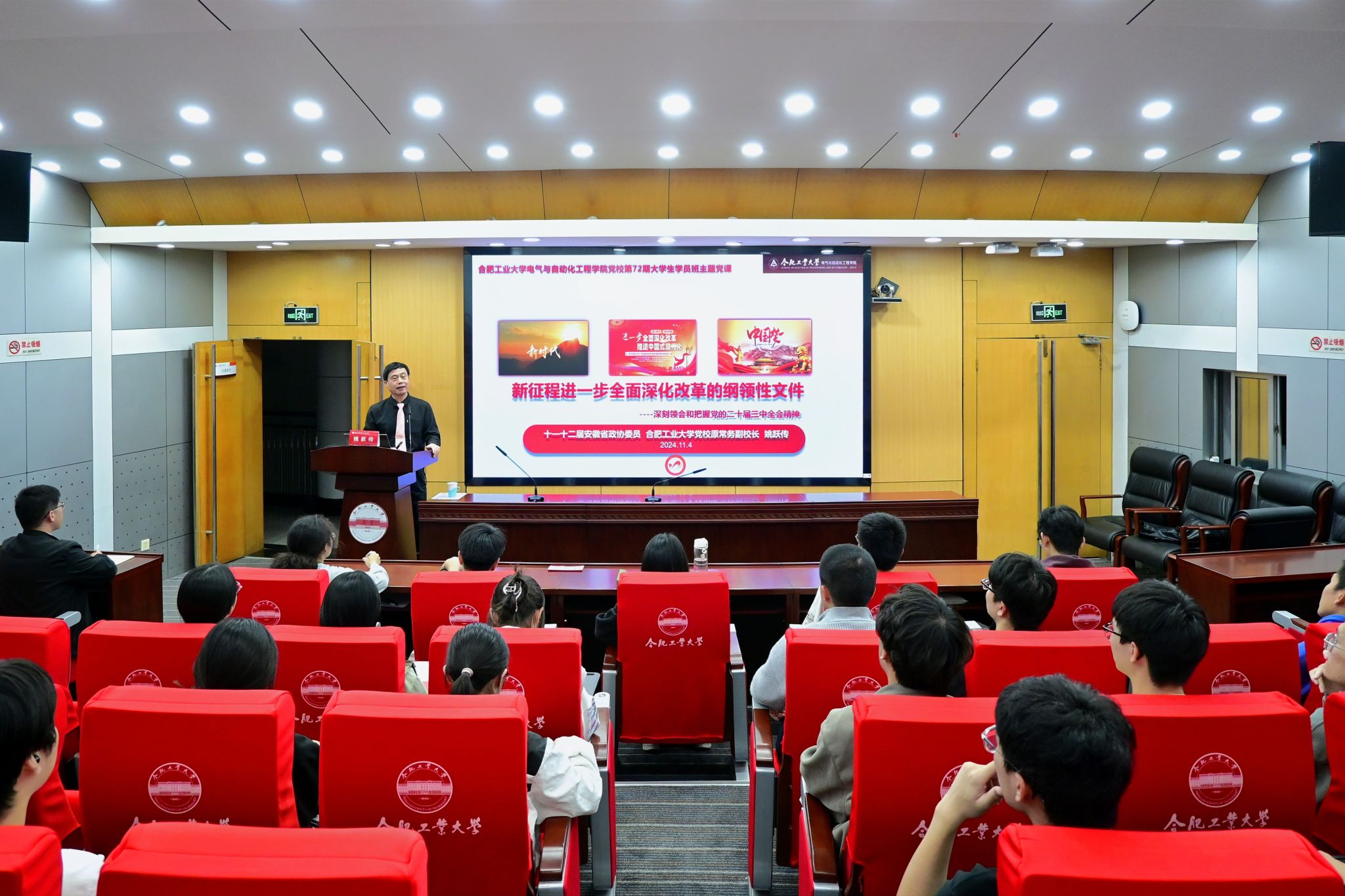 11月4日,电气与自动化工程学院分党校第十九期大学生入党积极分子班开展学习贯彻党的二十届三中全会精神主题党课,第十一、十二届安徽省政协委员、工口实验室