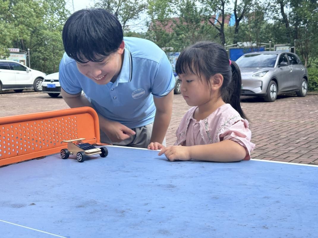 熠光织鳞·动手实践。课后的动手实践环节将本次三下乡科普课堂活动推向了高潮——团队成员指导学生们动手制作太阳能小车,使抽象的“渔光互补”发电原理和“双碳”节能目标变得直观可感。在场学生纷纷主动参与,上手操作,亲身实践,收获颇丰。