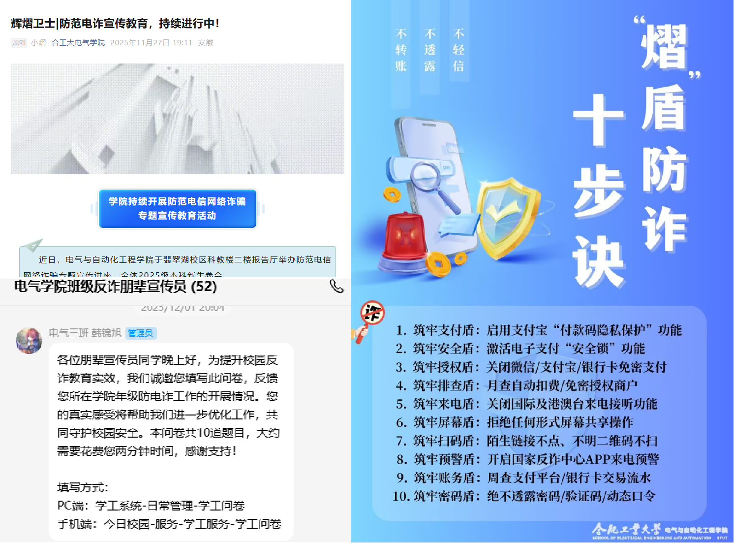 为常态化推进“无诈校园”建设,切实保障学生财产安全与合法权益,电气与自动化工程学院近期通过网格联动、集中赋能、骨干领航、网络育人等维度多措并举开展防范电信网络诈骗宣传教育工作。