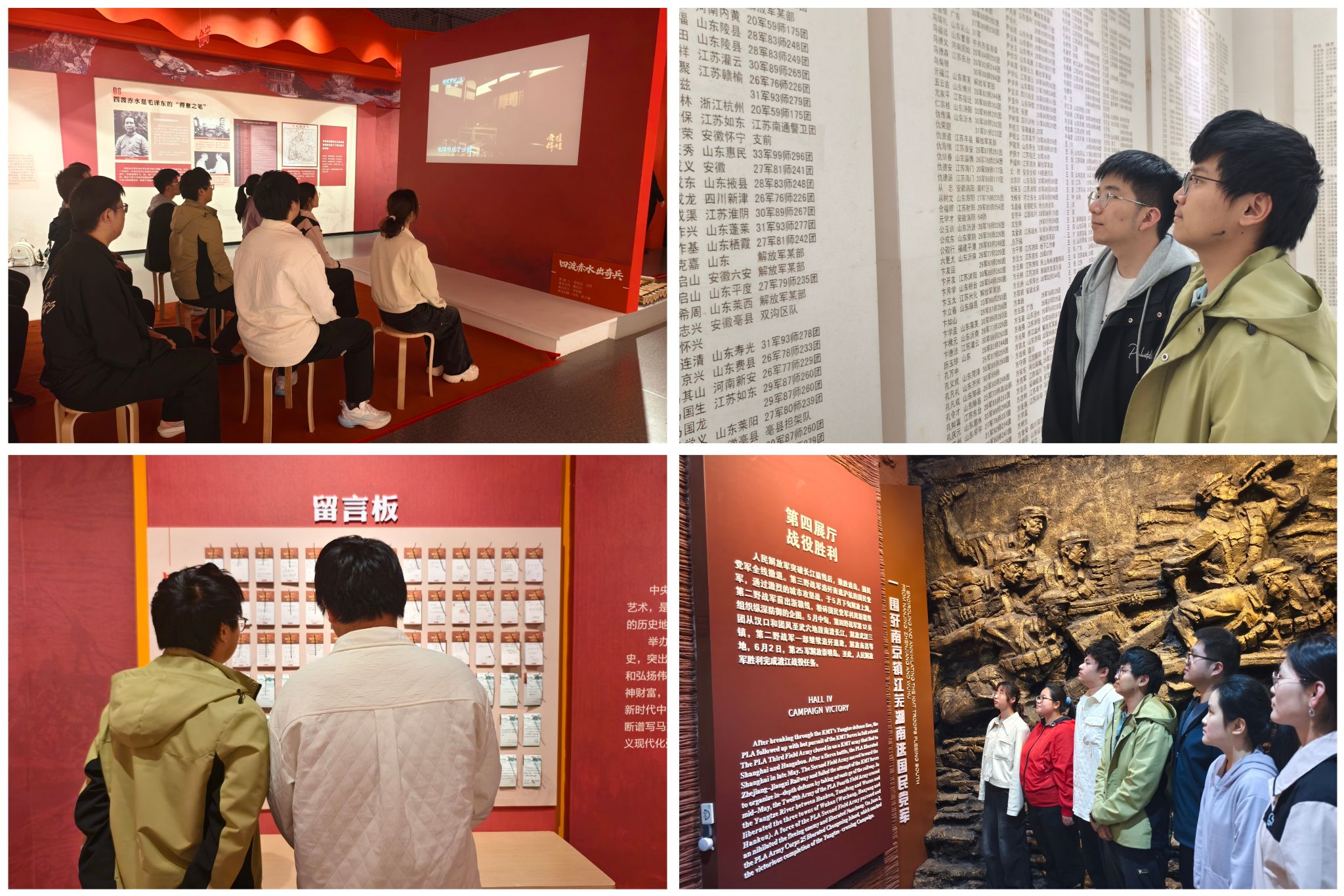 活动中,同学们先后参观了馆内多个主题展区,在历史展板、文物雕塑与影像资料的串联中,系统地回顾了渡江战役的壮阔历程,深刻感悟到革命先辈不畏艰险、奋勇向前的英雄气概,体会中国共产党人民军队浴血奋战的革命意志与坚定信仰。最后,大家在烈士名录前驻足肃立,向革命先烈致以崇高敬意,在留言板前许下青春誓言,纷纷表示要把革命先辈的精神力量转化为成长动力,以青年之姿勇担时代使命。