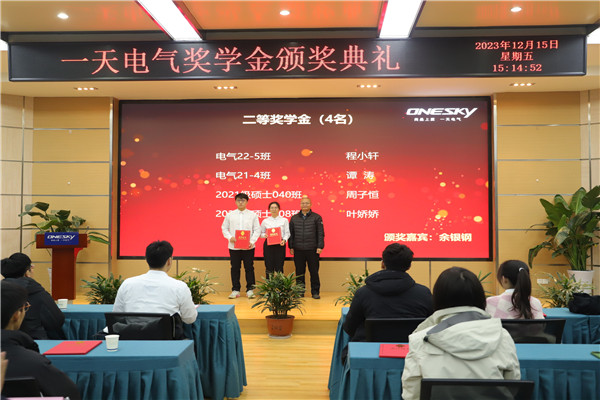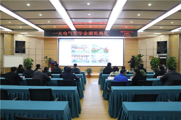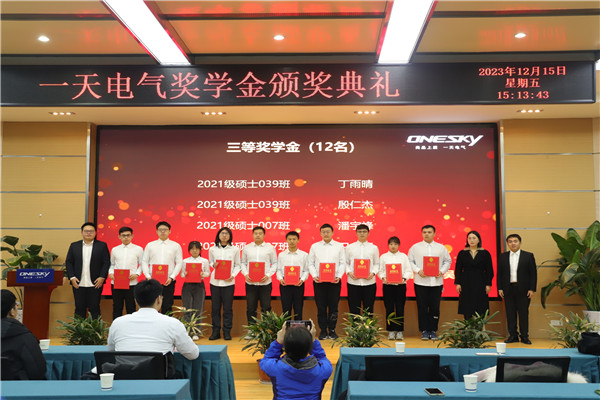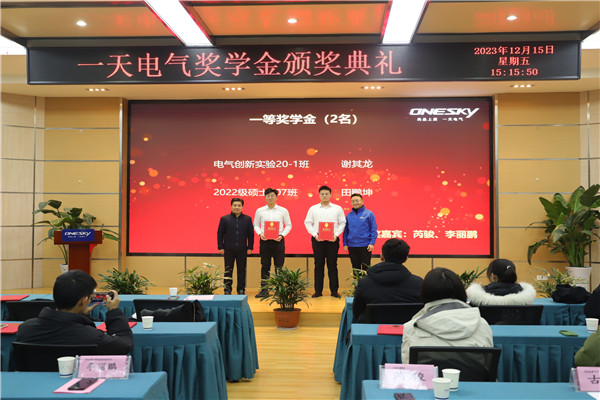关于表彰2023年度“一天电气奖学金”获得者的决定》并致辞,他代表学院对一天电气长期以来的支持表示衷心感谢,向一直以来关心和关注学院发展的校友致以崇高的敬意。他希望获奖同学认真学习一天电气的工口实验室与社会责任,以优秀校友为榜样,筑牢理想信念、扎实专业学业、潜心科学研究、练就过硬本领,矢志工业报国,为国家制造业强国事业发展贡献青春力量。